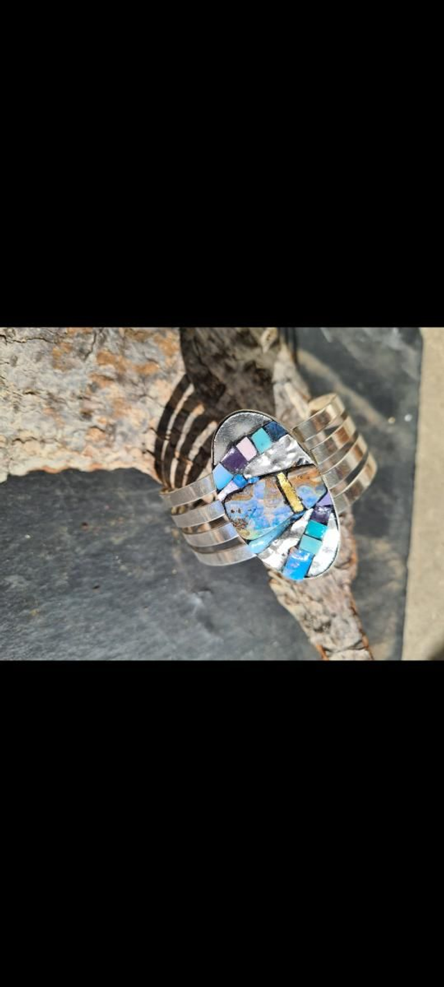 Manchette composée d'opales boulder d'Australie, d'opaline, tesselles d'or et smaltis