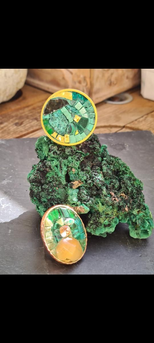 Bague composée de Malachite, labradorite, fushite, smaltis et tesselles d'or