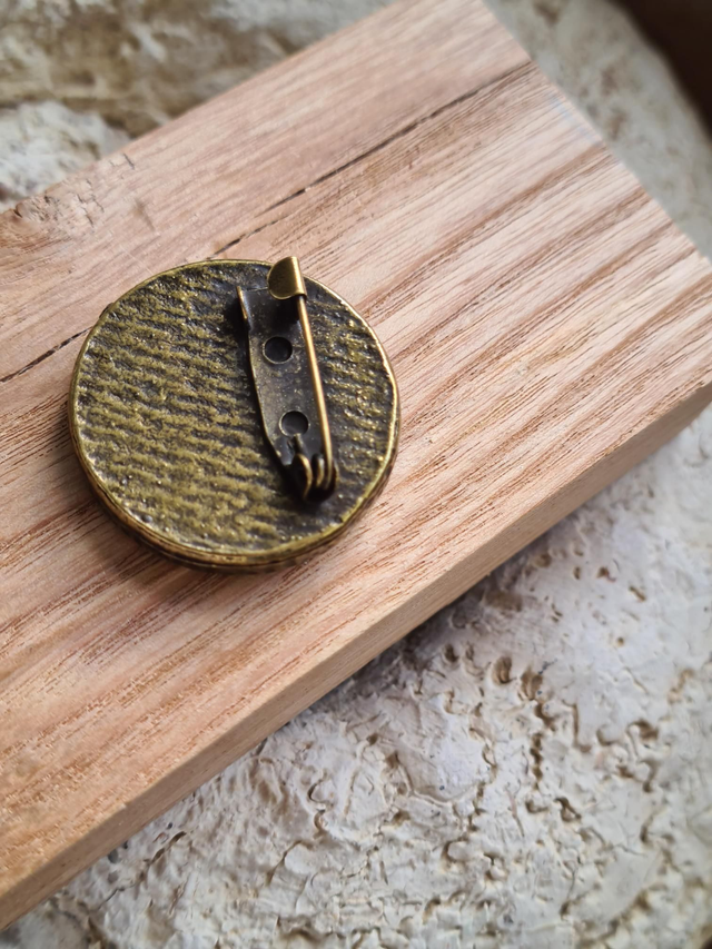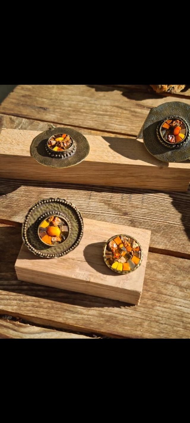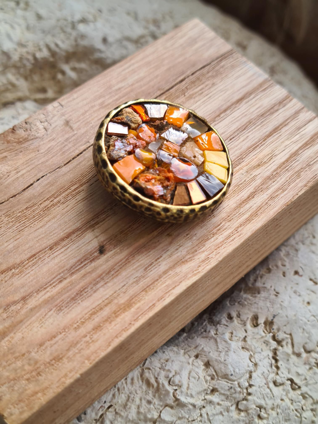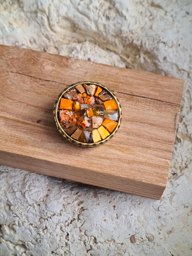 Broche composée de Crocoïte, tesselles d'or, pâte de verre, millefiori et smaltis.