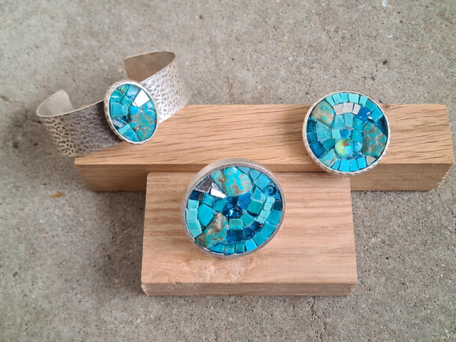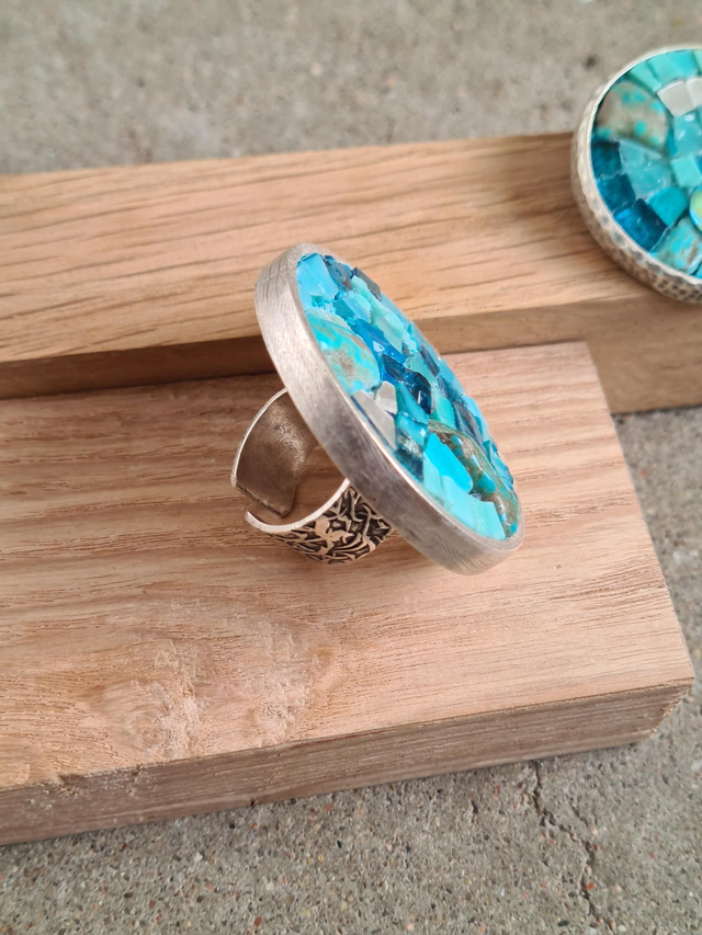 Bague composée de Turquoise, tesselles d'or, smaltis, pâte de verre, millefiori et cristal de Swarovski